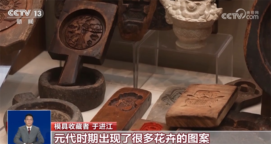 模具收藏者 于進(jìn)江:從宋代開(kāi)始,我們會(huì)發(fā)現(xiàn)模具里面就出現(xiàn)了玉兔搗藥的造型;元代時(shí)期出現(xiàn)了很多花卉的圖案;到了明代時(shí)期,加入了很多題材,有期盼中秋節(jié)蟾宮折桂的,有祝壽團(tuán)圓的;清代時(shí)期,(出現(xiàn)了)很多故事圖案月餅。