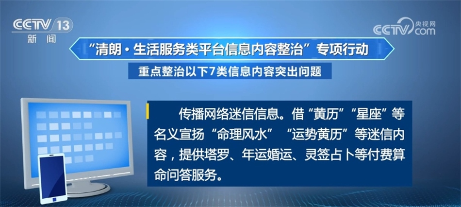 傳播網(wǎng)絡(luò)迷信信息。借“黃歷”“星座”等名義宣揚(yáng)“命理風(fēng)水”“運(yùn)勢黃歷”等迷信內(nèi)容,提供塔羅、年運(yùn)婚運(yùn)、靈簽占卜等付費(fèi)算命問答服務(wù)?!?/p>