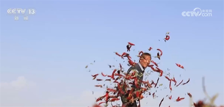 跟隨鏡頭,我們來到了新疆巴州和碩縣廣袤的戈壁灘上。眼下,50多萬畝紅辣椒進入全面采收晾曬季,放眼望去,一片片“紅色地毯”散發(fā)著熱辣的氣息。遍地的紅辣椒被有序鋪開,村民們穿梭其中,透著豐收的喜悅。當?shù)剞r(nóng)業(yè)部門測算,今年當?shù)乩苯樊a(chǎn)量可達140萬噸以上,辣椒采收及晾曬工作將持續(xù)至11月前后。