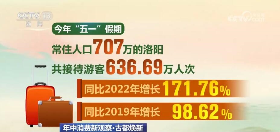 今年“五一”假期,常住人口707萬的洛陽共接待游客636.69萬人次,同比2022年增長171.76%,同比2019年增長98.62%,洛陽接待的游客量已和這座城市的常住人口數(shù)相差不多。