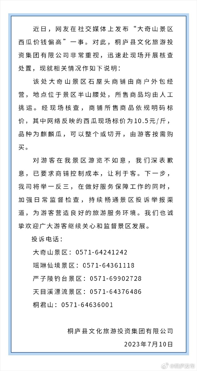 ·一游客反映大奇山景區(qū)一個西瓜賣200多元。10日,桐廬文旅集團(tuán)致歉稱,商品均由人工挑運,對游客在景區(qū)游覽不如意深表歉意,已要求商鋪控制成本,讓利于客。
