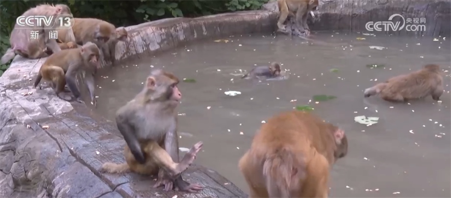管理員介紹,假如獼猴群棲息地附近沒有水源,保護(hù)區(qū)就會(huì)人為設(shè)置水池,從山下通過泵站把水抽上來(lái),供獼猴消夏解暑。