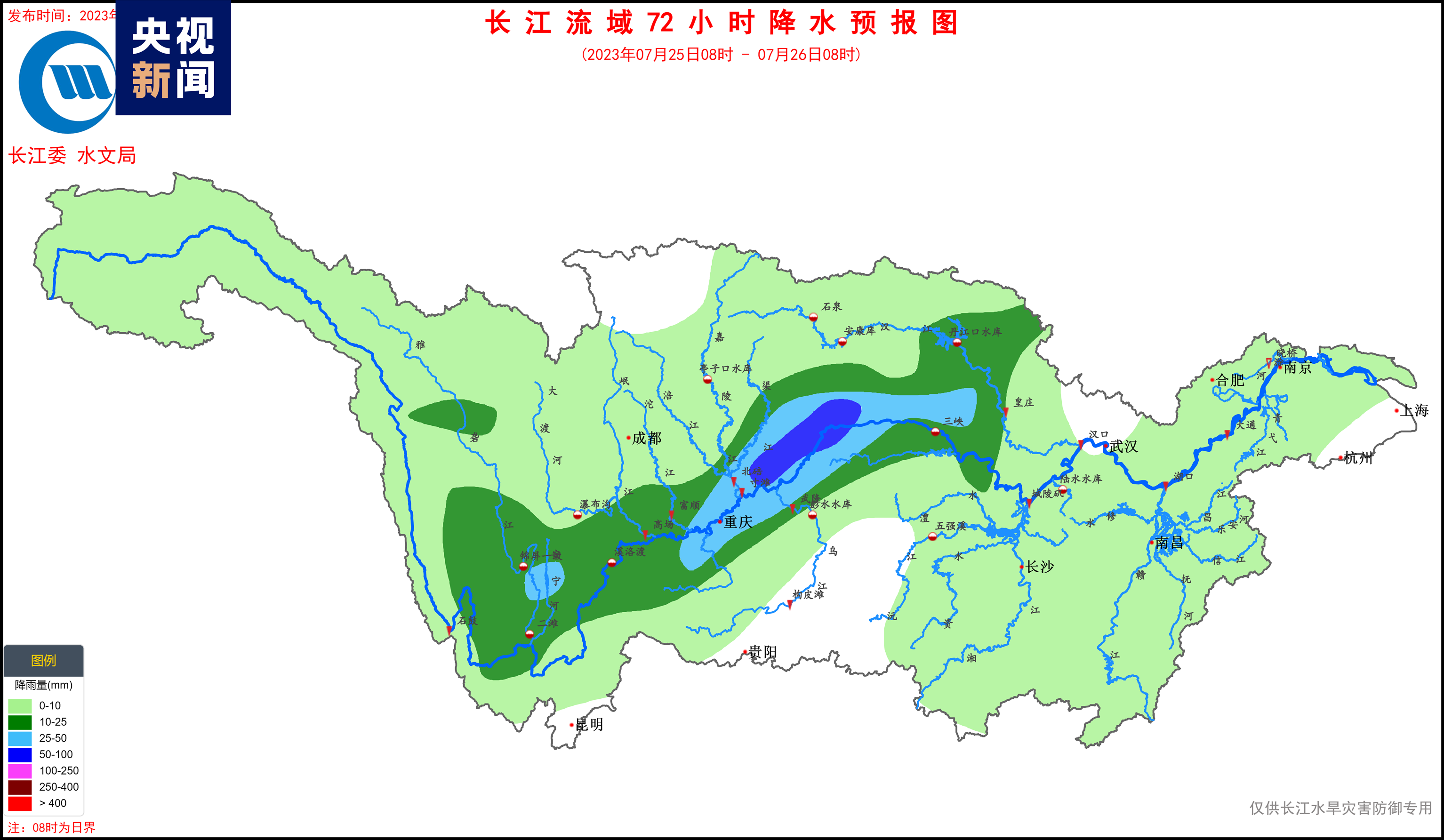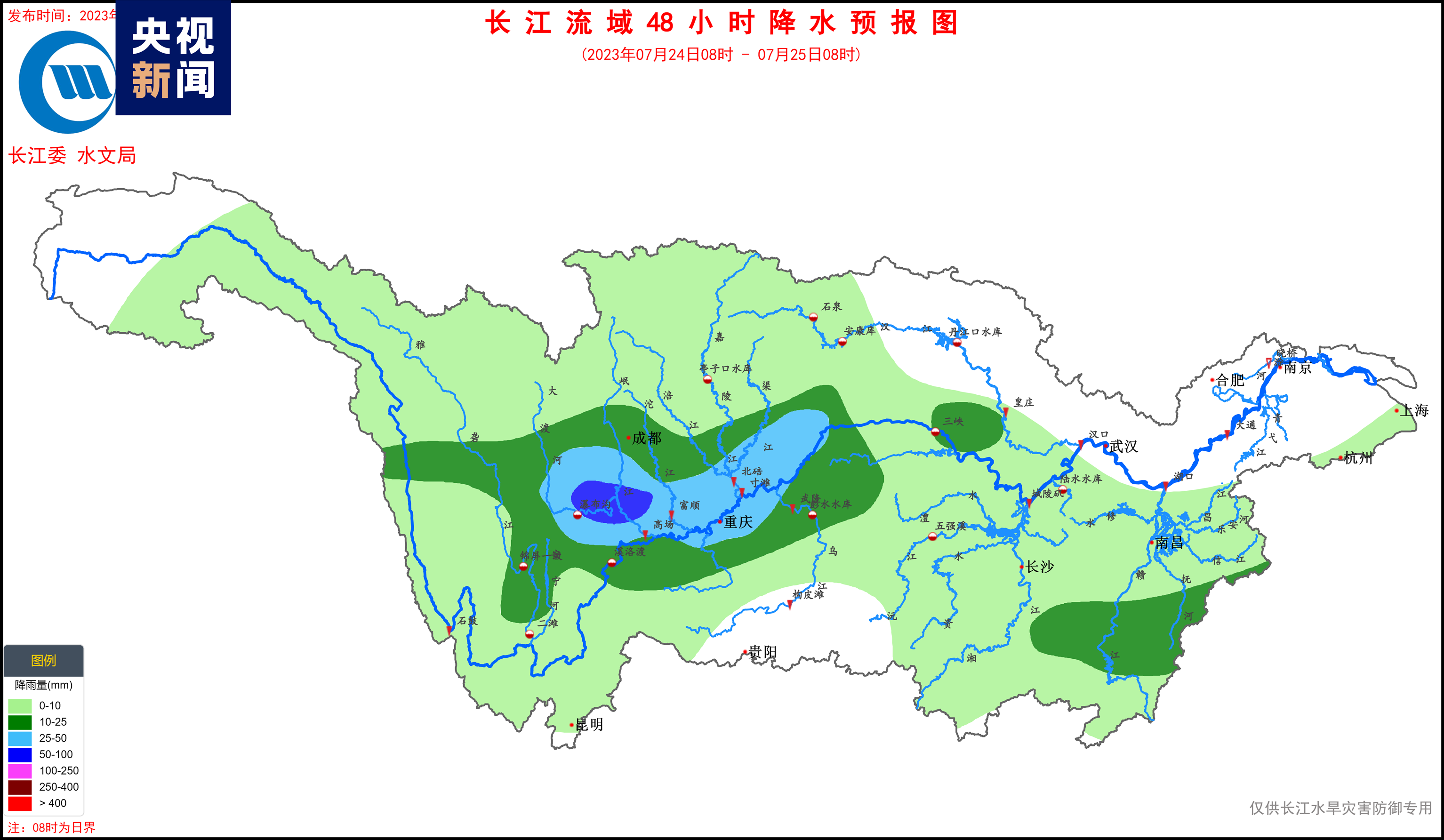 據(jù)水文氣象預(yù)報,7月23日,嘉岷流域北部有中雨、局地大雨;24~27日,長江上游干流附近有中到大雨、局地暴雨的降水過程,過程累計面雨量:長江上游干流70毫米,金沙江中下游、雅礱江、岷沱江、渠江、烏江上游30~50毫米。考慮預(yù)見期降雨,金沙江中下游、嘉岷流域、赤水河、烏江、三峽區(qū)間將發(fā)生漲水過程,降雨落區(qū)內(nèi)部分中小河流可能發(fā)生超警洪水,局部強降雨引發(fā)山洪災(zāi)害的風(fēng)險高。