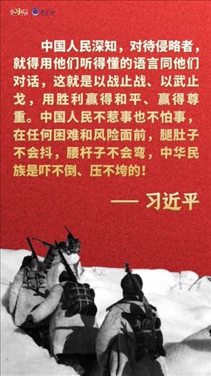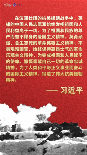 偉大抗美援朝精神跨越時(shí)空、歷久彌新。我們要銘記抗美援朝戰(zhàn)爭(zhēng)的艱辛歷程和偉大勝利,敢于斗爭(zhēng)、善于斗爭(zhēng),知難而進(jìn)、堅(jiān)韌向前,把新時(shí)代中國(guó)特色社會(huì)主義偉大事業(yè)不斷推向前進(jìn)。
