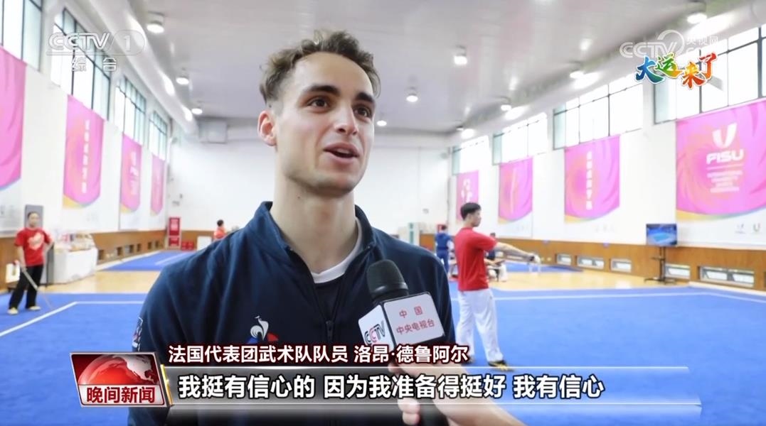 法國代表團(tuán)武術(shù)隊(duì)隊(duì)員 洛昂·德魯阿爾:我要比賽的項(xiàng)目是長拳和棍術(shù)。我每天都會(huì)訓(xùn)練,一天一般訓(xùn)練兩次。我挺有信心的,因?yàn)槲覝?zhǔn)備得挺好,我有信心。?
