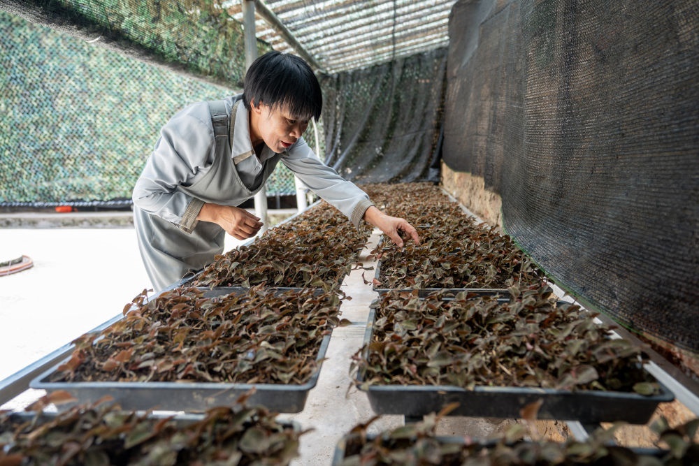 7月27日,謝成芬在家中搭建的大棚內(nèi)查看人工培養(yǎng)的金線蓮幼苗。新華社記者 陳欣波 攝
