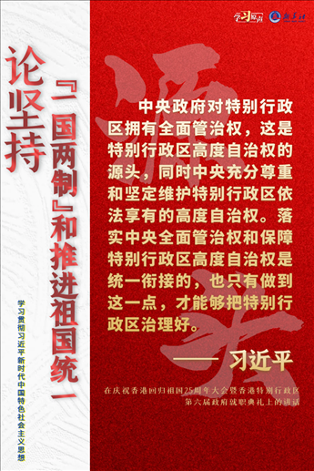 “一國(guó)兩制”是黨領(lǐng)導(dǎo)人民實(shí)現(xiàn)祖國(guó)和平統(tǒng)一的一項(xiàng)重要制度,是國(guó)家的一項(xiàng)基本國(guó)策。中國(guó)特色社會(huì)主義進(jìn)入了新時(shí)代,意味著“一國(guó)兩制”事業(yè)也進(jìn)入了新時(shí)代。不斷推進(jìn)“一國(guó)兩制”在香港、澳門(mén)的成功實(shí)踐,是中華民族偉大復(fù)興歷史進(jìn)程的重要組成部分。