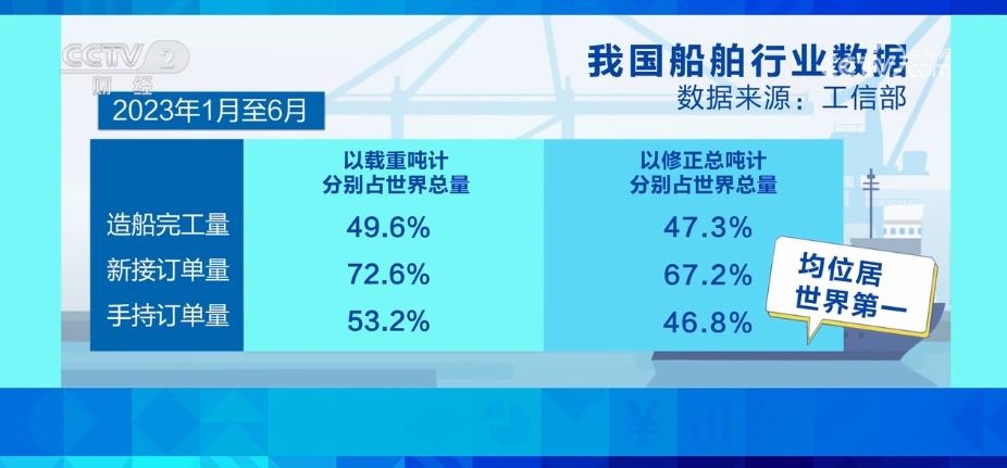 工業(yè)和信息化部數(shù)據(jù)顯示,2023年1月—6月,我國(guó)造船完工量、新接訂單量和手持訂單量,以載重噸計(jì)分別占世界總量的49.6%、72.6%和53.2%,以修正總噸計(jì)分別占47.3%、67.2%和46.8%,均位居世界第一。