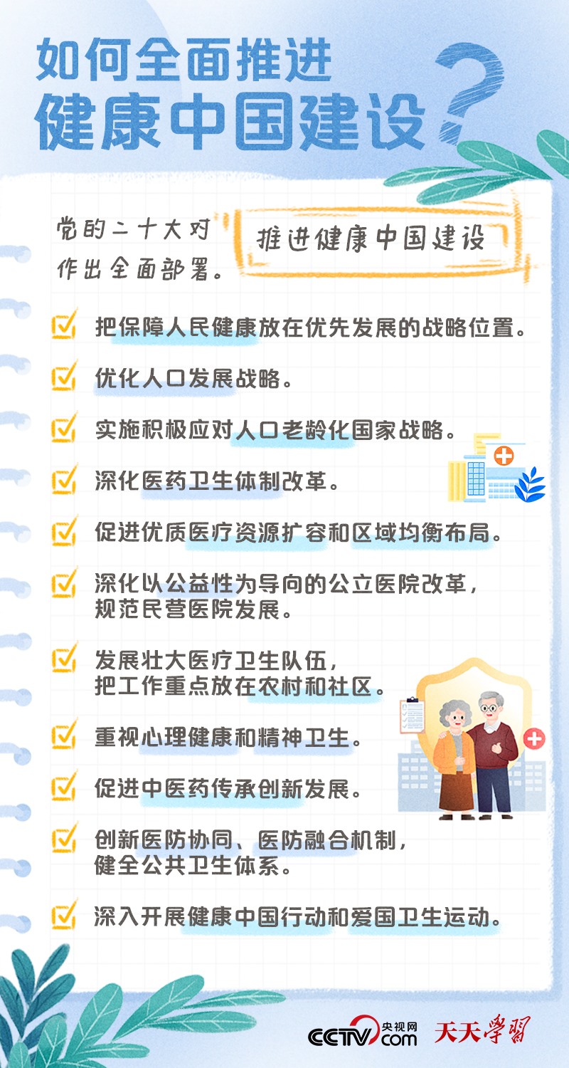 黨的二十大報(bào)告將“建成健康中國(guó)”作為到2035年我國(guó)發(fā)展的總體目標(biāo)之一,并指出,人民健康是民族昌盛和國(guó)家強(qiáng)盛的重要標(biāo)志,把保障人民健康放在優(yōu)先發(fā)展的戰(zhàn)略位置,完善人民健康促進(jìn)政策。什么是健康中國(guó)?如何全面推進(jìn)健康中國(guó)建設(shè)?央視網(wǎng)《天天學(xué)習(xí)·學(xué)習(xí)筆記》特梳理相關(guān)內(nèi)容,為您解讀總書記治國(guó)理政關(guān)鍵詞——健康中國(guó)。