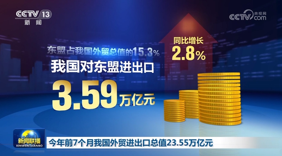 前7個(gè)月,我國(guó)對(duì)第一大貿(mào)易伙伴東盟進(jìn)出口3.59萬億元,同比增長(zhǎng)2.8%。對(duì)中亞五國(guó)進(jìn)出口3316.9億元,同比增長(zhǎng)35%。對(duì)拉丁美洲、非洲分別進(jìn)出口1.92萬億元和1.14萬億元,同比分別增長(zhǎng)5.5%和7.4%。