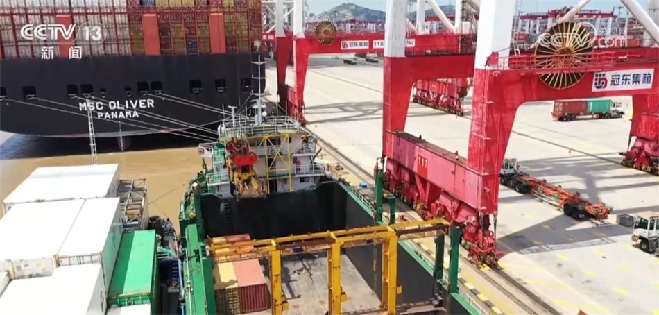 在洋山港三期冠東碼頭,兩艘大型遠洋集裝箱船中間的這艘小船是來自江蘇太倉港的快航班輪,它剛剛完成200多個集裝箱裝卸。通過水路完成“水水中轉(zhuǎn)”,將這些集裝箱裝上遠洋貨輪出口海外,無需轉(zhuǎn)關申報或倉儲停留,實現(xiàn)了聯(lián)動接卸。