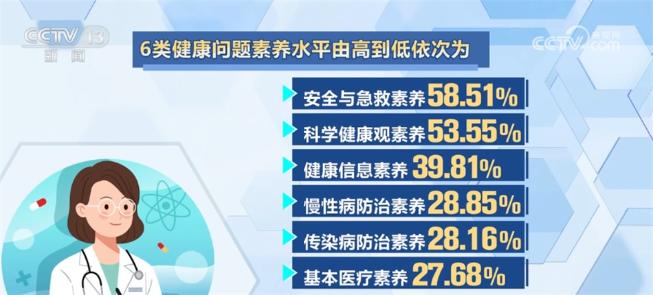 6類健康問(wèn)題素養(yǎng)水平由高到低依次為:安全與急救素養(yǎng)58.51%、科學(xué)健康觀素養(yǎng)53.55%、健康信息素養(yǎng)39.81%、慢性病防治素養(yǎng)28.85%、傳染病防治素養(yǎng)28.16%和基本醫(yī)療素養(yǎng)27.68%。各類健康問(wèn)題素養(yǎng)均有不同程度提升,其中,健康信息素養(yǎng)水平增幅最大,較2021年提升了3.88個(gè)百分點(diǎn)。本次監(jiān)測(cè)覆蓋31個(gè)省(自治區(qū)、直轄市)的336個(gè)縣(區(qū))1008個(gè)鄉(xiāng)鎮(zhèn)(街道),對(duì)象為15—69歲常住人口。