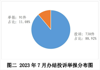 2023年7月,12398熱線共接收投訴舉報(bào)1316件,環(huán)比增長39.70%、同比下降27.01%。其中:投訴1149件,環(huán)比增長41.85%、同比下降33.66%;舉報(bào)167件,環(huán)比增長26.52%、同比增長135.21%。