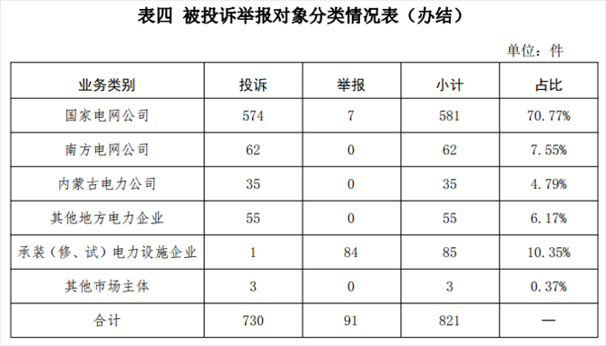 從被投訴舉報(bào)對象看,供電企業(yè)733件、占投訴舉報(bào)總數(shù)的89.28%,其中國家電網(wǎng)公司581件、占比70.77%,南方電網(wǎng)公司62件、占比7.55%,內(nèi)蒙古電力公司35件、占比3.65%,其他地方電力企業(yè)55件、占比6.17%;承裝(修、試)電力設(shè)施企業(yè)85件、占比10.35%;其他市場主體3件、占比0.37%。