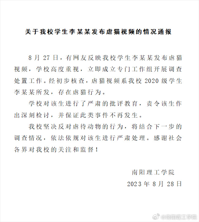 ·南陽理工學(xué)院通報“學(xué)生發(fā)布虐貓視頻”:責(zé)令其作出深刻檢討,將進(jìn)行嚴(yán)肅處理。