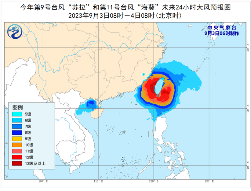 大風預(yù)報:9月3日08時至4日08時,受“蘇拉”影響,北部灣、瓊州海峽以及廣西南部沿海、海南島北部沿海等地將有6-7級大風,其中北部灣部分海域?qū)⒂?級、陣風9-10級的大風;受“??庇绊懀褪亢{、臺灣海峽、臺灣以東洋面、東海南部及釣魚島附近海域以及浙江南部沿海、福建沿海、臺灣島沿海將有6-8級、陣風9-10級大風,部分海域或地區(qū)的風力有9-12級,陣風13-14級,“??敝行慕?jīng)過的附近海面或地區(qū)的風力有13-16級,陣風17級。