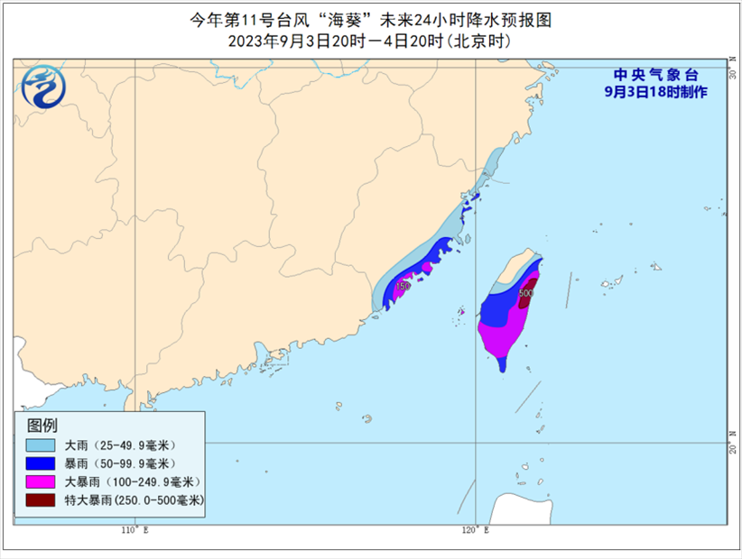 降水預(yù)報:9月3日20時至4日20時,福建東部、浙江東南部沿海、臺灣島等地有大到暴雨,其中,福建東南部沿海、臺灣島東部和南部等地部分地區(qū)有大暴雨,臺灣島東部局地特大暴雨(250~500毫米);上述地區(qū)最大小時降雨量20~50毫米,局地可超過60毫米,局地還有雷暴大風(fēng)等強對流天氣。