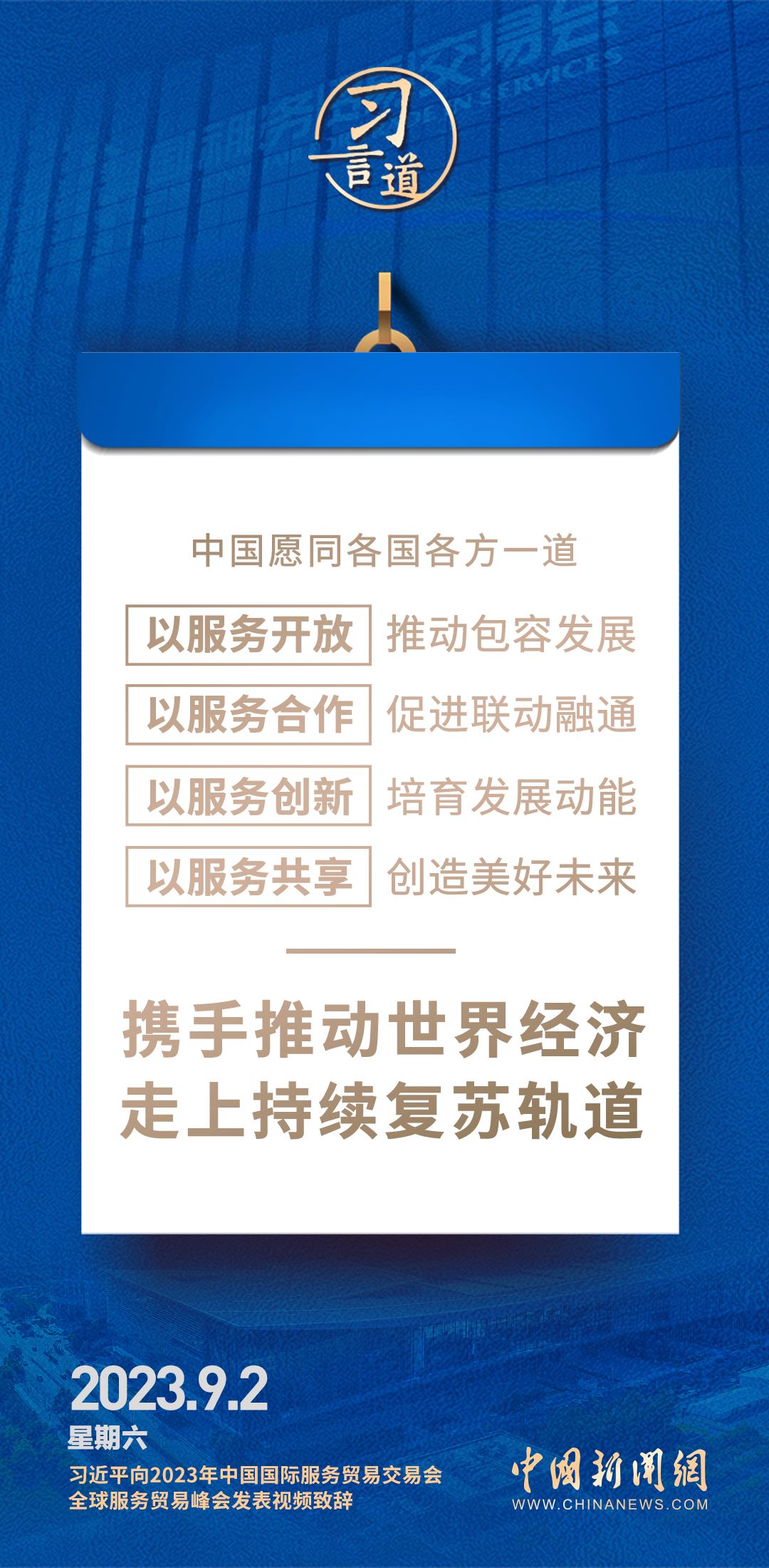 9月2日上午,國家主席習(xí)近平在北京向2023年中國國際服務(wù)貿(mào)易交易會(huì)全球服務(wù)貿(mào)易峰會(huì)發(fā)表視頻致辭。習(xí)近平指出——