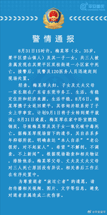 ·重慶警方通報女子攜子女家中燒炭自殺。