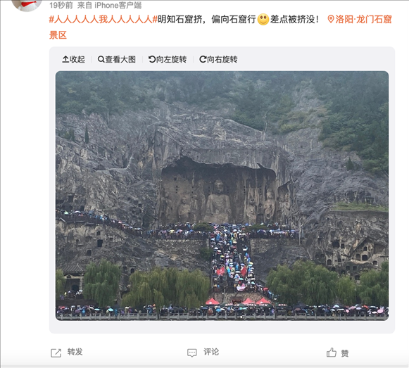 有定位在龍門石窟景區(qū)的網友發(fā)布圖片并配文稱:“明知石窟擠,偏向石窟行。差點被擠沒!”