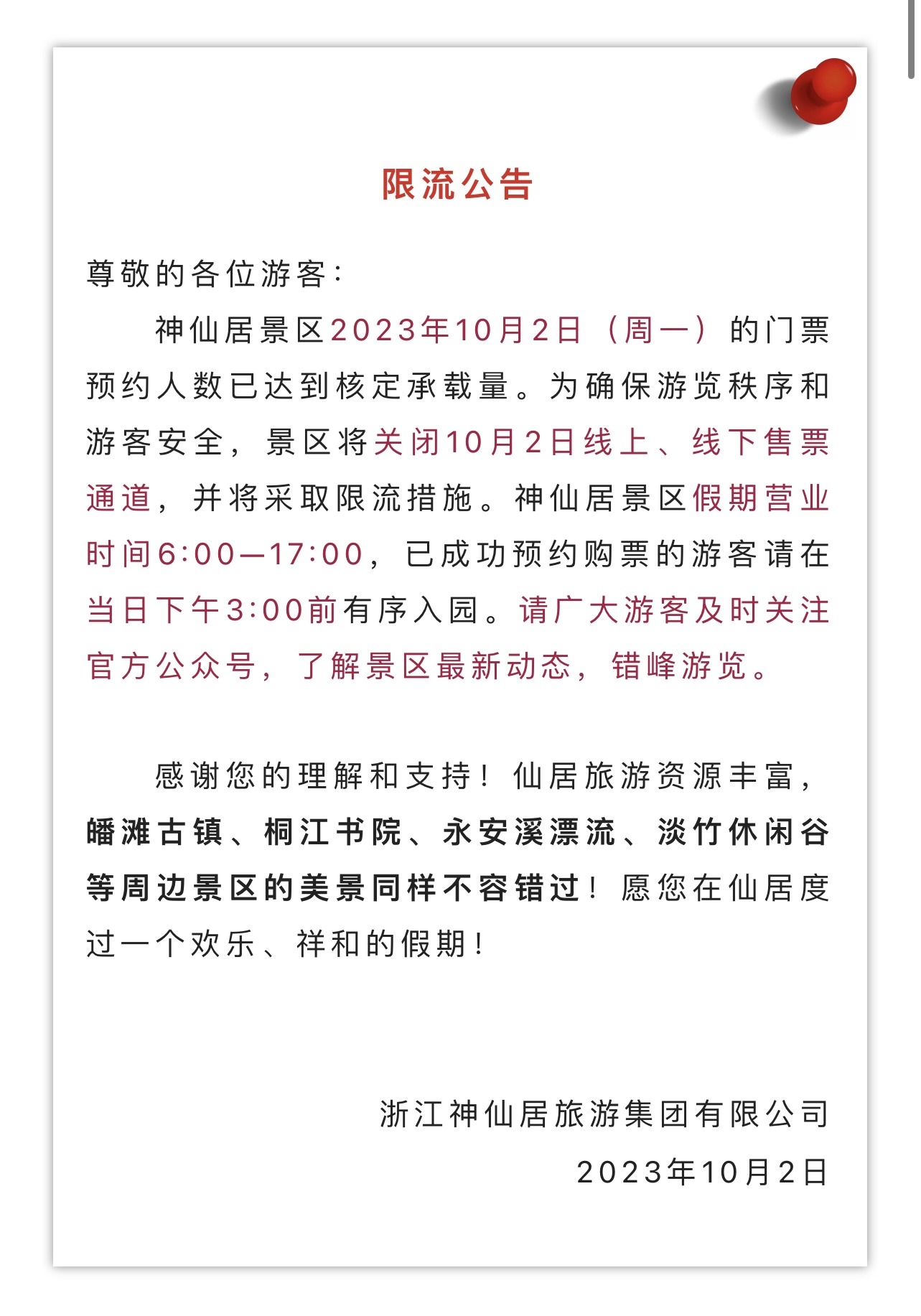 臺州神仙居景區(qū)于10月2日零點就發(fā)布當日門票已約滿的消息。
