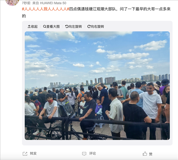 前往浙江錢塘江觀潮的網友發(fā)布消息稱:“四點偶遇錢塘江觀潮大部隊,問了一下最早的大哥一點多來的”。