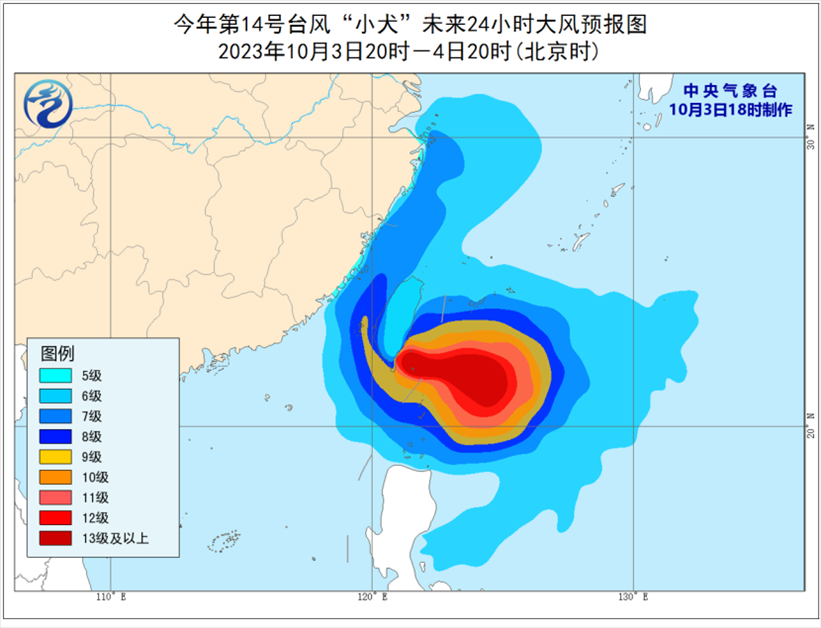 大風預報:3日20時至4日20時,東海西部及釣魚島附近海域、臺灣以東洋面、巴士海峽、臺灣海峽、南海東北部以及浙江沿海、福建沿海、臺灣島沿海將有6-8級、陣風9-10級大風,臺灣島東南部海面、巴士海峽北部海面、臺灣海峽東南部海面的風力將有9-12級、陣風13-14級,“小犬”中心經過的附近海面或地區(qū)風力可達13-16級,陣風17級。