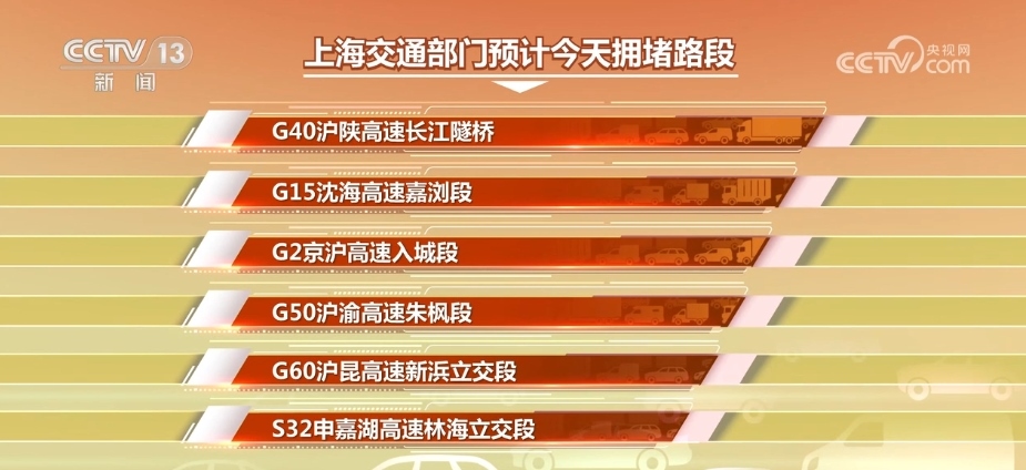 上海交通部門預計,返程高峰期間,G40滬陜高速長江隧橋、G15沈海高速嘉瀏段、G2京滬高速入城段、G50滬渝高速朱楓段、G60滬昆高速新浜立交段、S32申嘉湖高速林海立交段等入城方向將產(chǎn)生一定擁堵。