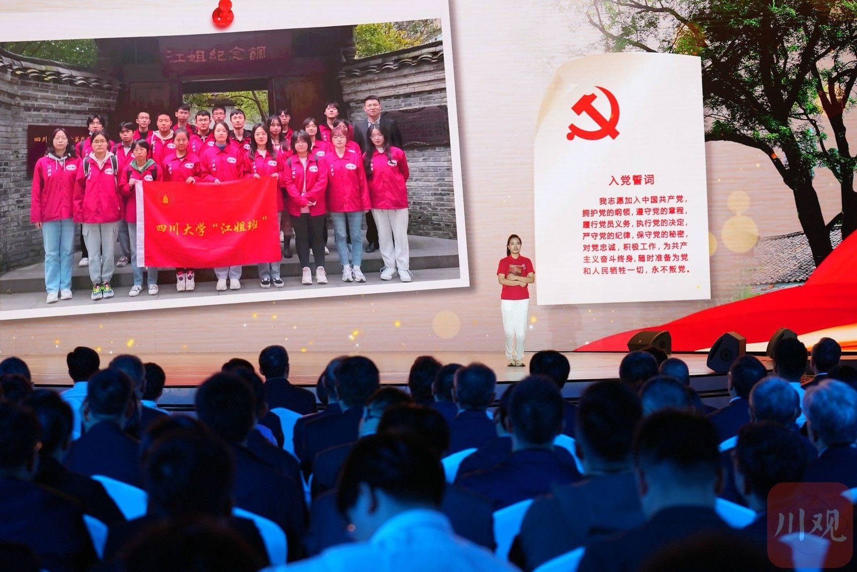 在 “錦水含章”篇章中,以歌曲《紅梅贊》引入,《江姐在川大》編劇冉詩媛、四川大學(xué)“江姐班”學(xué)生代表張鈺、“江姐紀(jì)念館”設(shè)計(jì)者段禹農(nóng)、第49屆南丁格爾獎獲得者蔣艷和四川大學(xué)三星堆遺址考古隊(duì)隊(duì)長黎海超等結(jié)合工作學(xué)習(xí)實(shí)踐,動情講述傳承江姐精神矢志報(bào)國、援外抗疫展現(xiàn)大愛、創(chuàng)新賦能文博考古故事,生動詮釋紅色傳承、文脈賡續(xù)、人民至上。