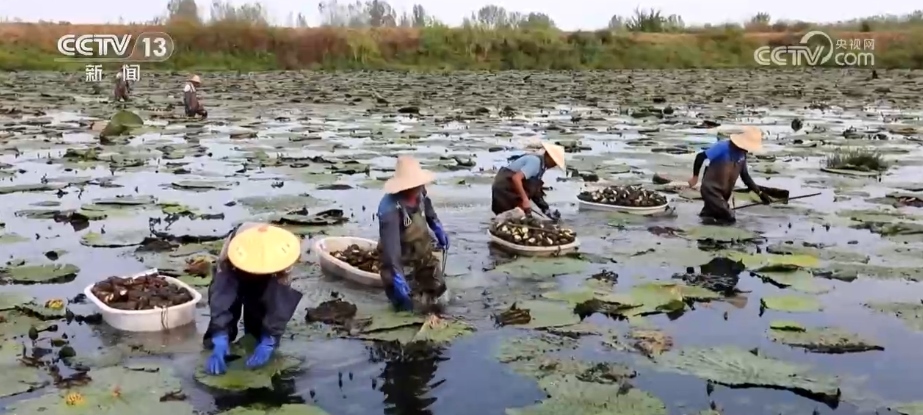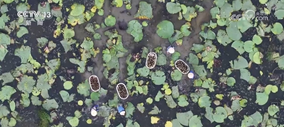 在安徽霍邱縣宋店鎮(zhèn)小路芡實種植家庭農場,十幾名工人正在水中采摘芡實。
