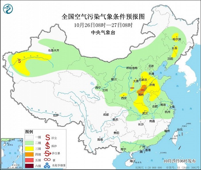 央視網(wǎng)消息:據(jù)中央氣象臺網(wǎng)站消息,10月24日至25日,華北中南部、黃淮北部等地大氣擴(kuò)散條件較差,部分地區(qū)有輕至中度霾,北京南部、天津、河北中部局地可達(dá)重度霾。24日早晨至上午,北京南部、天津中北部、河北中部、江蘇中南部等地的部分地區(qū)有大霧,局地有強(qiáng)濃霧。26日凌晨起,受冷空氣影響,華北、黃淮等地大氣擴(kuò)散條件自北向南逐漸轉(zhuǎn)好。