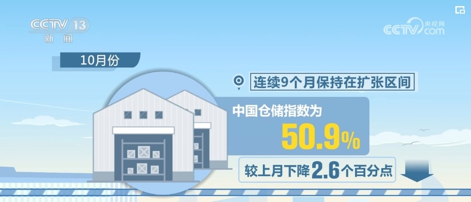 10月份,中國(guó)倉(cāng)儲(chǔ)指數(shù)為50.9%,較上月下降2.6個(gè)百分點(diǎn),連續(xù)9個(gè)月保持在擴(kuò)張區(qū)間。
