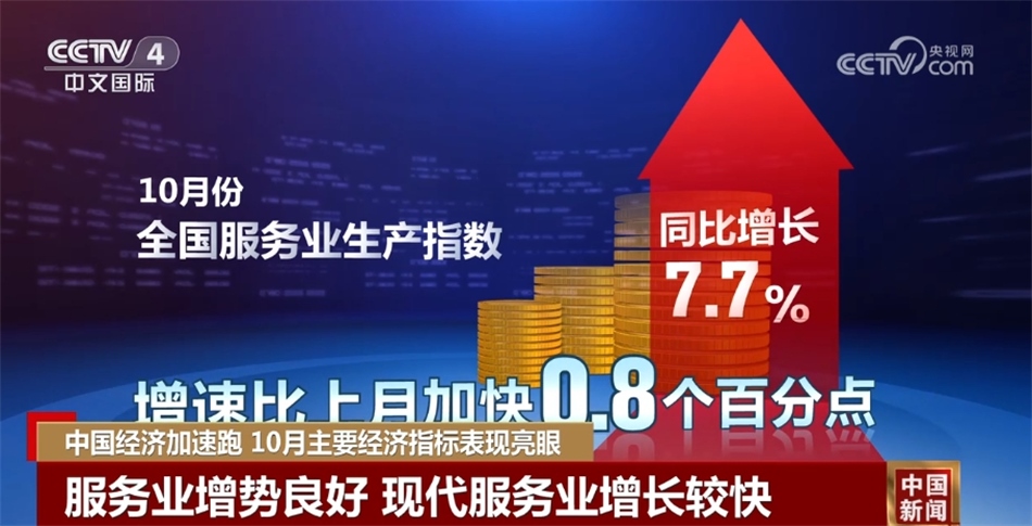 再來看服務業(yè)。服務業(yè)增勢良好,現(xiàn)代服務業(yè)增長較快。10月份,服務業(yè)生產指數(shù)同比增長7.7%,比上月加快0.8個百分點。其中,住宿和餐飲業(yè)、批發(fā)和零售業(yè)、交通運輸倉儲和郵政業(yè)等聚集型服務業(yè)都保持兩位數(shù)增長。