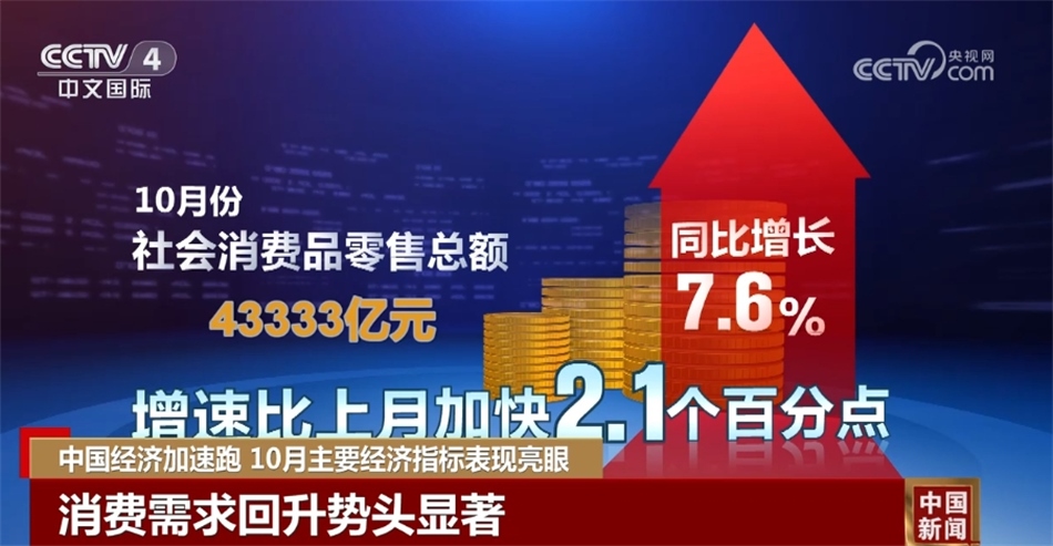 此外,消費需求回升勢頭顯著。10月份,社會消費品零售總額43333億元,同比增長7.6%,增速比上月加快2.1個百分點。與此同時,升級類消費也穩(wěn)步恢復。10月份,汽車類、金銀珠寶類、體育娛樂用品類商品零售額同比增速均比上月加快。