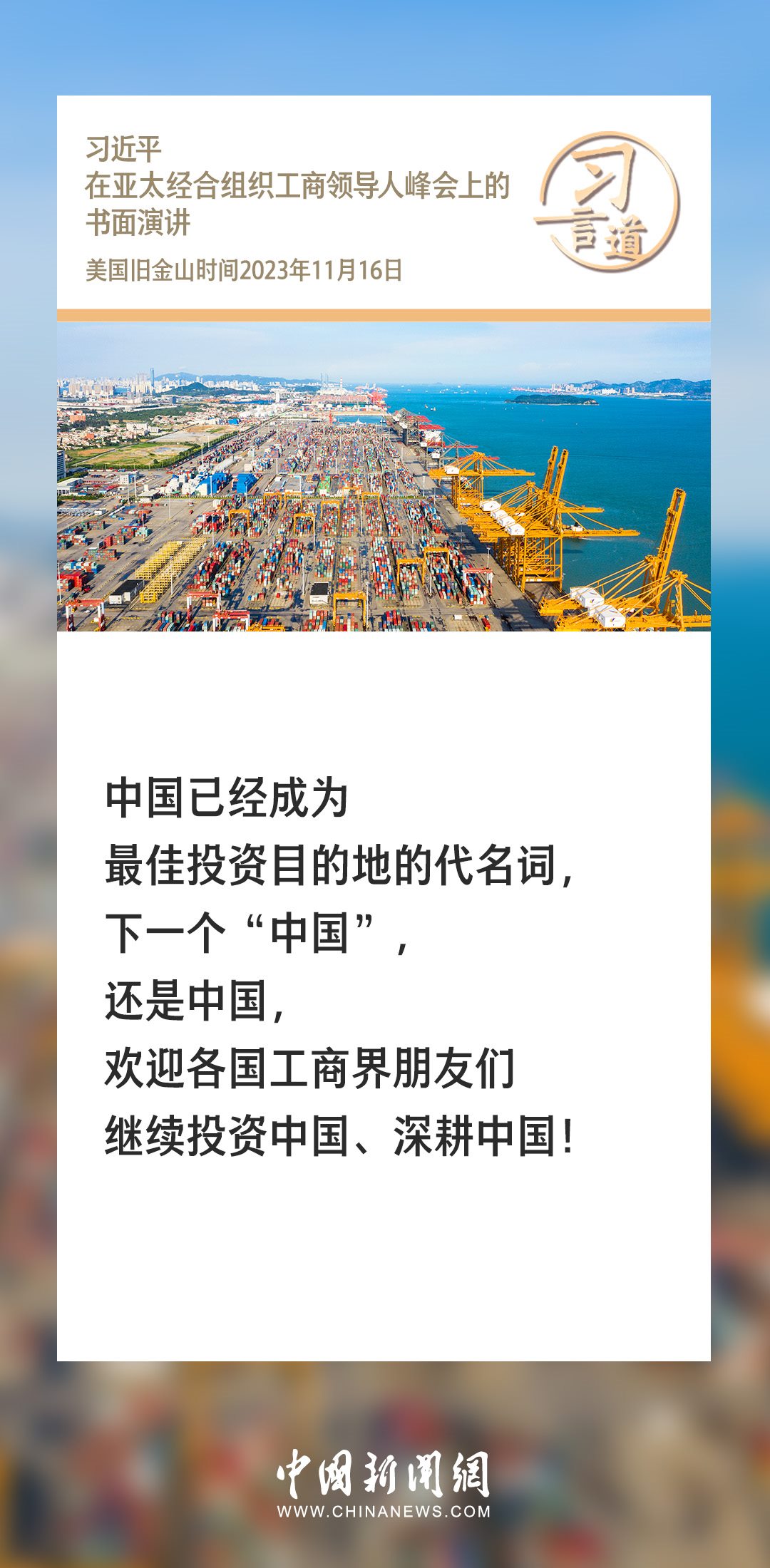當地時間11月16日上午,國家主席習近平向在舊金山舉行的亞太經合組織工商領導人峰會發(fā)表題為《同心協(xié)力 共迎挑戰(zhàn) 譜寫亞太合作新篇章》的書面演講。習近平指出——