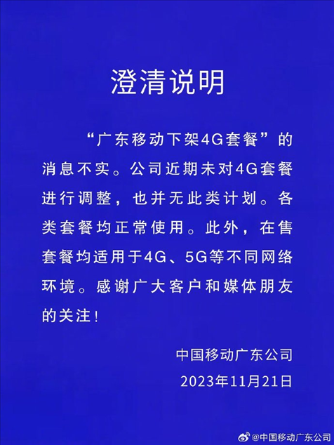 ·中國(guó)移動(dòng)廣東公司:“下架4G套餐”消息不實(shí),也無(wú)此類計(jì)劃。