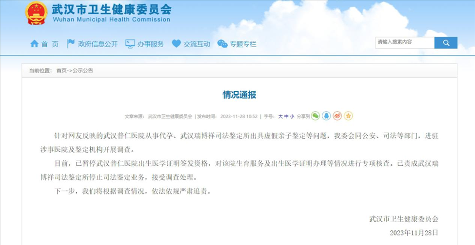 ·武漢衛(wèi)健委通報(bào)“普仁醫(yī)院從事代孕、武漢瑞博祥司法鑒定所出具虛假親子鑒定”情況。
