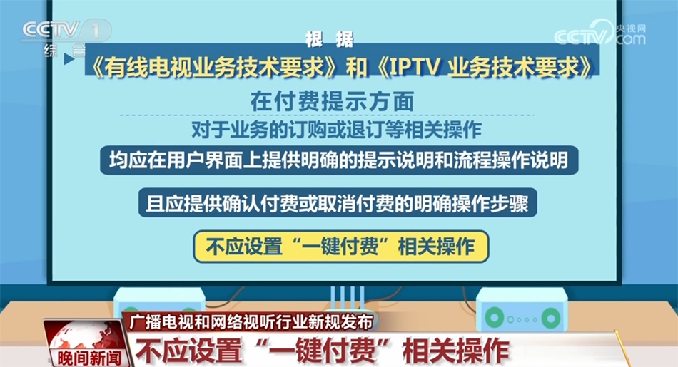 在付費(fèi)提示方面,對于業(yè)務(wù)的訂購或退訂等相關(guān)操作,均應(yīng)在用戶界面上提供明確的提示說明和流程操作說明,且應(yīng)提供確認(rèn)付費(fèi)或取消付費(fèi)的明確操作步驟,不應(yīng)設(shè)置“一鍵付費(fèi)”相關(guān)操作。此外,有線電視和IPTV遙控器應(yīng)具備快捷看直播頻道的按鍵,通過此按鍵直接進(jìn)入全屏直播,按鍵名稱應(yīng)為“看電視”。