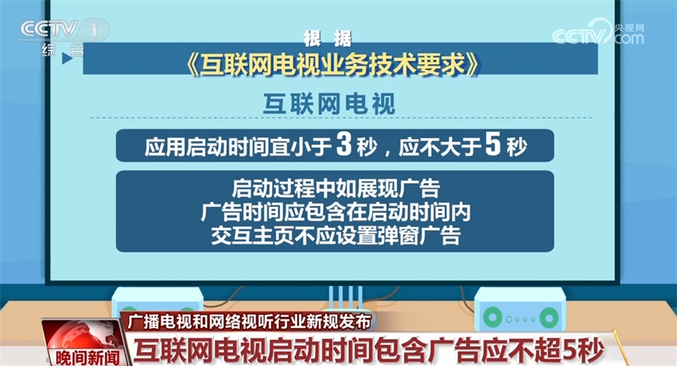 根據(jù)《互聯(lián)網(wǎng)電視業(yè)務(wù)技術(shù)要求》,互聯(lián)網(wǎng)電視應(yīng)用啟動時間宜小于3秒,應(yīng)不大于5秒,啟動過程中如展現(xiàn)廣告,廣告時間應(yīng)包含在啟動時間內(nèi)。交互主頁不應(yīng)設(shè)置彈窗廣告。交互主頁應(yīng)設(shè)置顯著、便捷的免費(fèi)業(yè)務(wù)專區(qū)入口。在付費(fèi)提示方面,互聯(lián)網(wǎng)電視對于業(yè)務(wù)的訂購或退訂等相關(guān)操作不應(yīng)設(shè)置“一鍵付費(fèi)”,對于任何業(yè)務(wù)的定期或連續(xù)扣費(fèi),均應(yīng)在扣費(fèi)前明確、主動提示用戶。