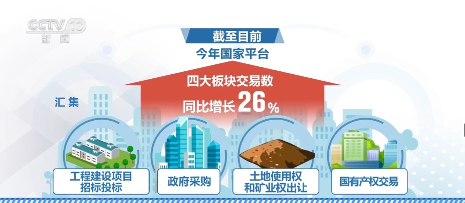 另外,全國公共資源交易平臺上的交易信息匯集發(fā)布量又創(chuàng)新高。截至目前,2023年國家平臺匯集工程建設項目招標投標、政府采購、土地使用權和礦業(yè)權出讓、國有產權交易這四大板塊交易數同比增長26%。