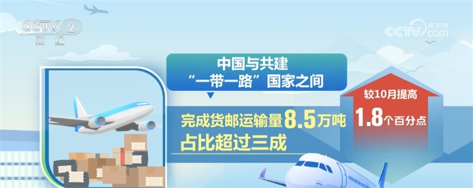 國際航線中,我國航空公司在中國至歐洲航線完成貨郵運輸量最大,達10.9萬噸,占比近四成;中國至亞洲其他國家航線貨運恢復(fù)水平最高;中國至北美航線貨運繼續(xù)恢復(fù),完成6.2萬噸;中國與共建“一帶一路”國家之間完成貨郵運輸量8.5萬噸,占比超過三成,較10月提高1.8個百分點。