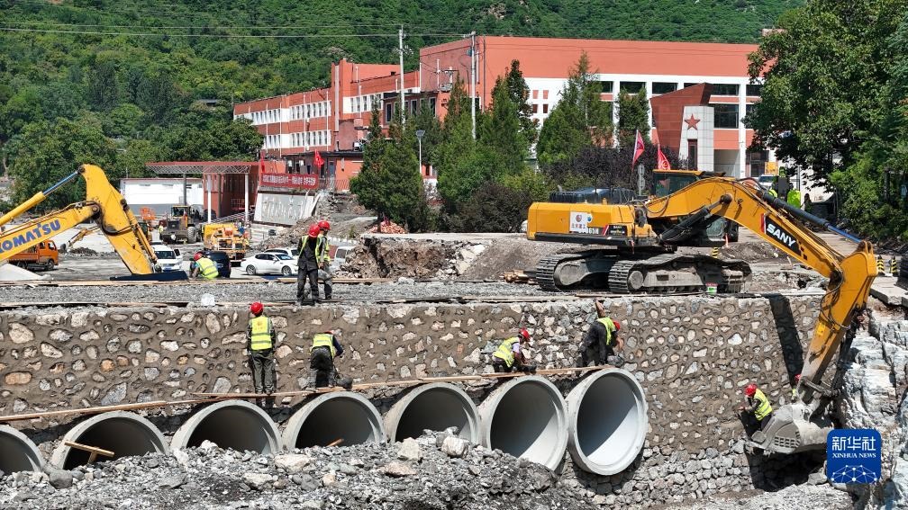 在北京市房山區(qū)霞云嶺中心小學(xué),北京建工機(jī)施集團(tuán)的施工人員在搶建供學(xué)校與外界通行的新橋梁(2023年8月23日攝,無人機(jī)照片)。新華社記者 鞠煥宗 攝