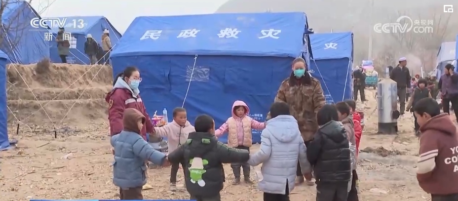 在康吊村三社的臨時安置點(diǎn),來自甘肅省第二人民醫(yī)院的心理治療師李轉(zhuǎn)雄正帶著村里的孩子做游戲。丟手絹、老鷹抓小雞,在一遍又一遍的追逐當(dāng)中,孩子們的笑聲越來越響亮。