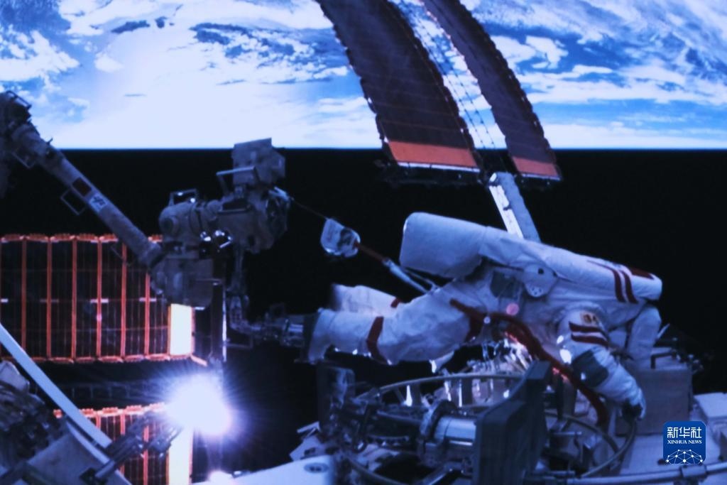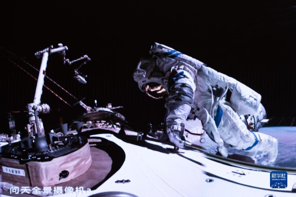 12月21日在北京航天飛行控制中心拍攝的神舟十七號航天員江新林協(xié)同兩名艙外航天員實(shí)施出艙活動的畫面。新華社記者 李杰 攝