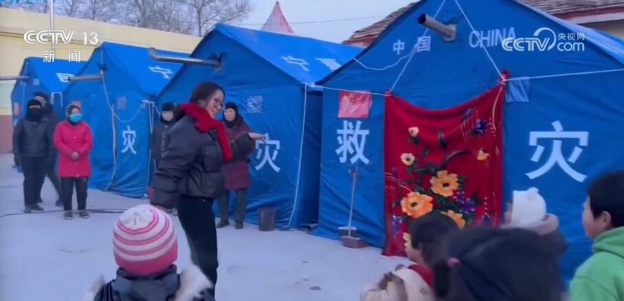 現(xiàn)在,臨時安置點搭建起一頂帳篷,作為學生們的“臨時帳篷課堂”,這會兒老師正在給孩子普及地震的相關知識和一些心理課程,并且?guī)е⒆觽冏龊唵蔚挠螒?,讓孩子在彼此的溝通和交流中舒緩心中的壓力,積蓄力量。