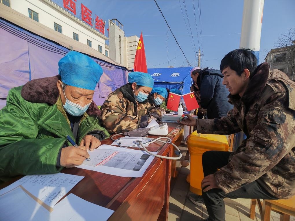 12月21日,在積石山中西醫(yī)結(jié)合醫(yī)院門外馬路邊,醫(yī)生為受災(zāi)群眾看病。新華社記者 范培珅 攝