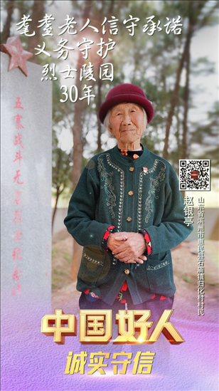 趙銀亭,女,1929年10月生,中共黨員,山東省濱州市惠民縣石廟鎮(zhèn)歸化村村民。趙銀亭是一位有75年黨齡的老黨員。1992年,當(dāng)?shù)亟⒘沂苛陥@,需要一位守陵人,63歲的趙銀亭主動(dòng)報(bào)了名。自此,她與丈夫搬到了距烈士陵園不過(guò)15米的舊屋居住。30多年來(lái),她堅(jiān)守信仰,守護(hù)烈士陵園,為前來(lái)參觀(guān)的人員講述英烈故事。