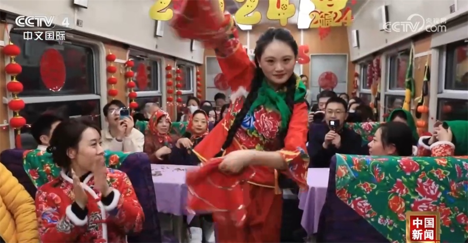 總臺(tái)央視記者 楊曜語(yǔ):我即將登上的列車就是從哈爾濱開(kāi)往漠河的國(guó)內(nèi)首個(gè)沉浸式東北民俗文化體驗(yàn)列車,坐過(guò)的人都說(shuō)一上車就想盤(pán)腿兒了,我們趕緊來(lái)體驗(yàn)一下!一上車我就被濃濃的東北文化所感染到了,整個(gè)車廂都被東北大花的經(jīng)典配色裝飾著,再加上隨手就能品嘗到東北特色美食,坐在床鋪上就感覺(jué)一秒鐘“穿越”到農(nóng)家炕頭。