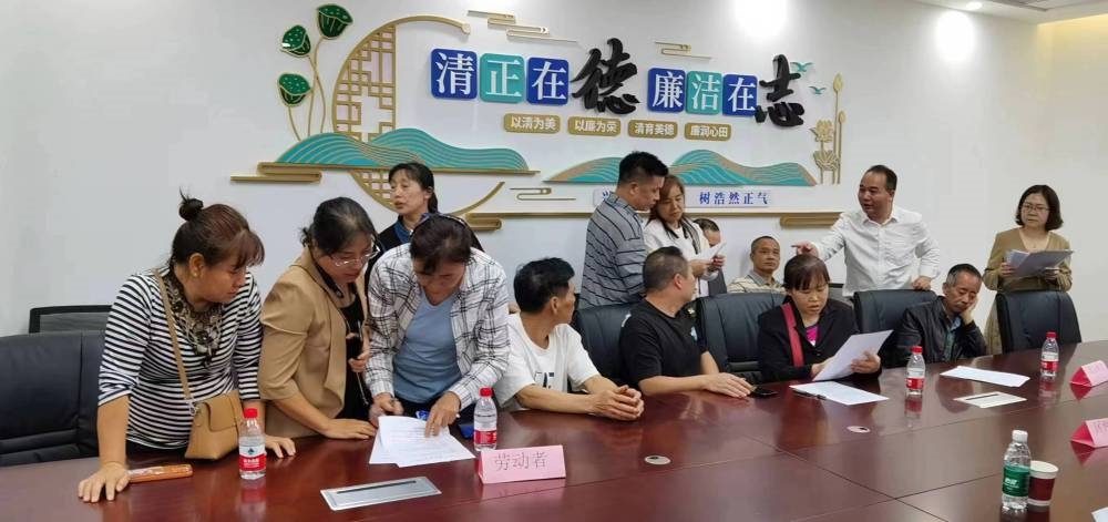 圖為廣州市白云區(qū)勞動人事爭議仲裁院院長李擁華(后排右二)在調(diào)解欠薪爭議現(xiàn)場。(廣州市白云區(qū)勞動人事爭議仲裁院供圖)
