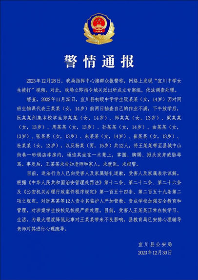 ·陜西宜川警方通報(bào)“宜川中學(xué)女生被打”:12人被責(zé)令嚴(yán)加管教。